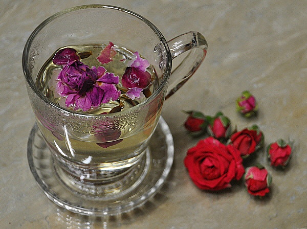 장미차는 여성에게 좋은 효능을 지니고 있는데 폐경이나 변비 등에 효과적이고 비타민 C가 많아 노화방지 및 피로회복에도 좋다. 특히 장미꽃의 다양한 색상을 내는 안토시아닌은 활성산소를 제거하고 콜라겐 형성을 촉진하며 베타카로틴은 항암효과가 있는 것으로 알려져 있다. 장미꽃잎은 비타민 E와 K를 함유하고 있어 피부를 재생시켜 주는데 효과적이며, 유해환경이나 화장으로 지친 피부를 생기있게 해주는 데도 효과적이다. 피부를 맑고 깨끗하게 개선시켜주고, 피부가 화끈거리는 것을 가라 앉혀준다. 항염제로도 사용되고 또한 갈라진 손바닥과 발바닥을 치료하는 데도 사용된다. 특히 화려하고 풍부한 향은 스트레스 저항 호르몬 분비를 촉진하며 스트레스를 해소시키고 신경 안정 작용을 하여 숙면에 도움을 주어 피부 트러블의 근본적인 원인을 없애준다.